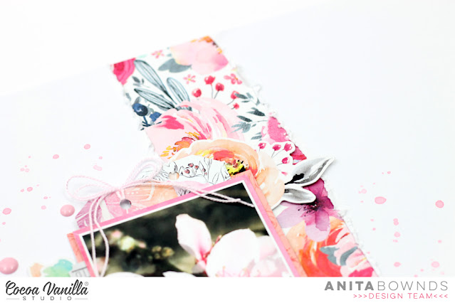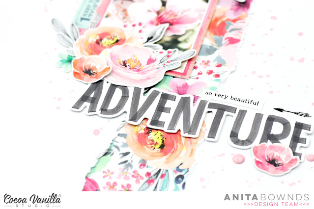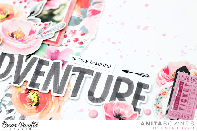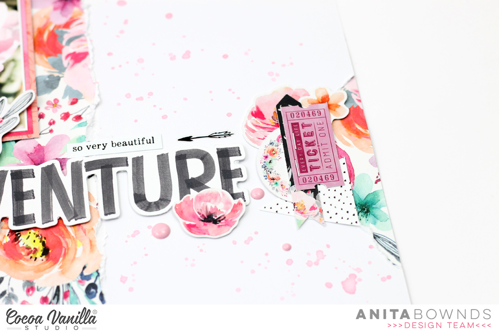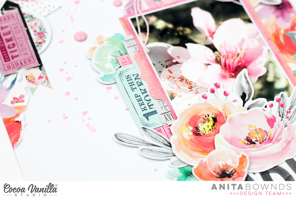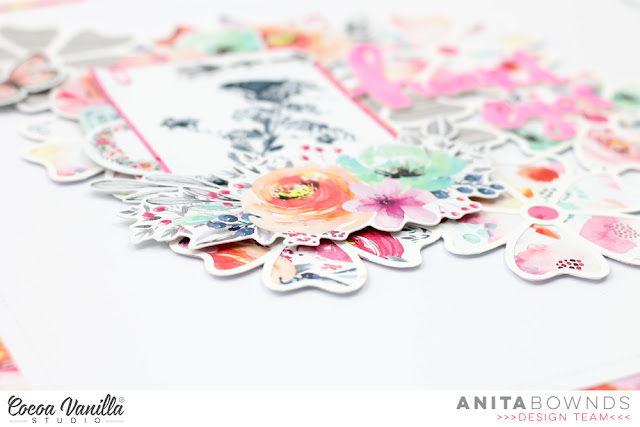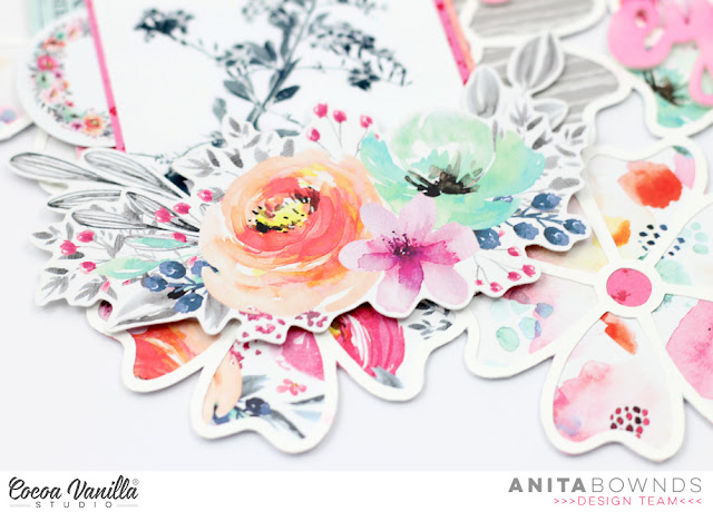 I embellished the base of my photo with a huge cluster of flowers from the Die Cut Ephemera pack. I also added a few leaves that I created with watercolor to mimic the ephemera leaves.