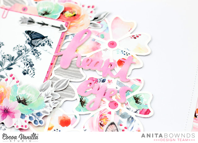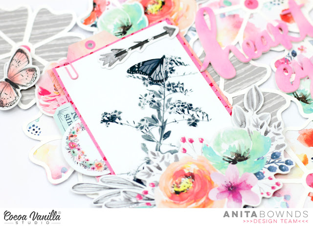 Peeking out from behind the fold I placed some flowers from the Die Cut Ephemera pack. I could never have enough of these flowers. To give more dimension to the page I raised them with foam dots. I also fussy cut a butterfly from the Pretty Bits paper, and stacked it behind the flowers. To finish the cluster I put a sticker phrase from the Accessory Stickers.