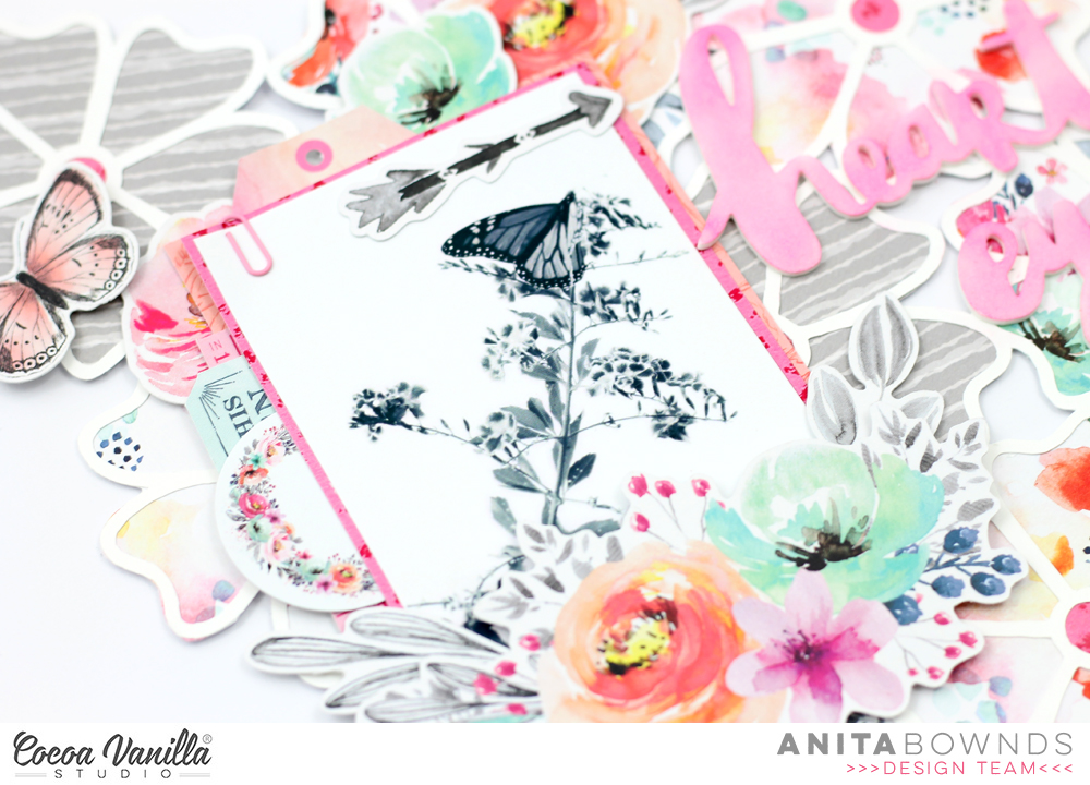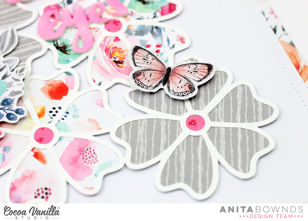 I added clusters of flowers using the ephemera at the top and bottom of my photo and scattered a few butterflies to tie in with the theme
