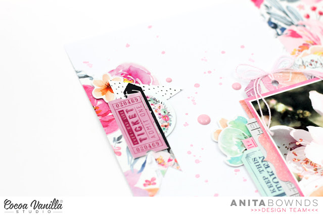 I framed my photo with this wood polaroid frame from the Daydream Die Cut Ephemera pack and raised it with foam to make it stand out. I embellished it all around by creating clusters of flowers from the die cut pack too. I tried to give some dimension to the page raising some flowers with foam dots.